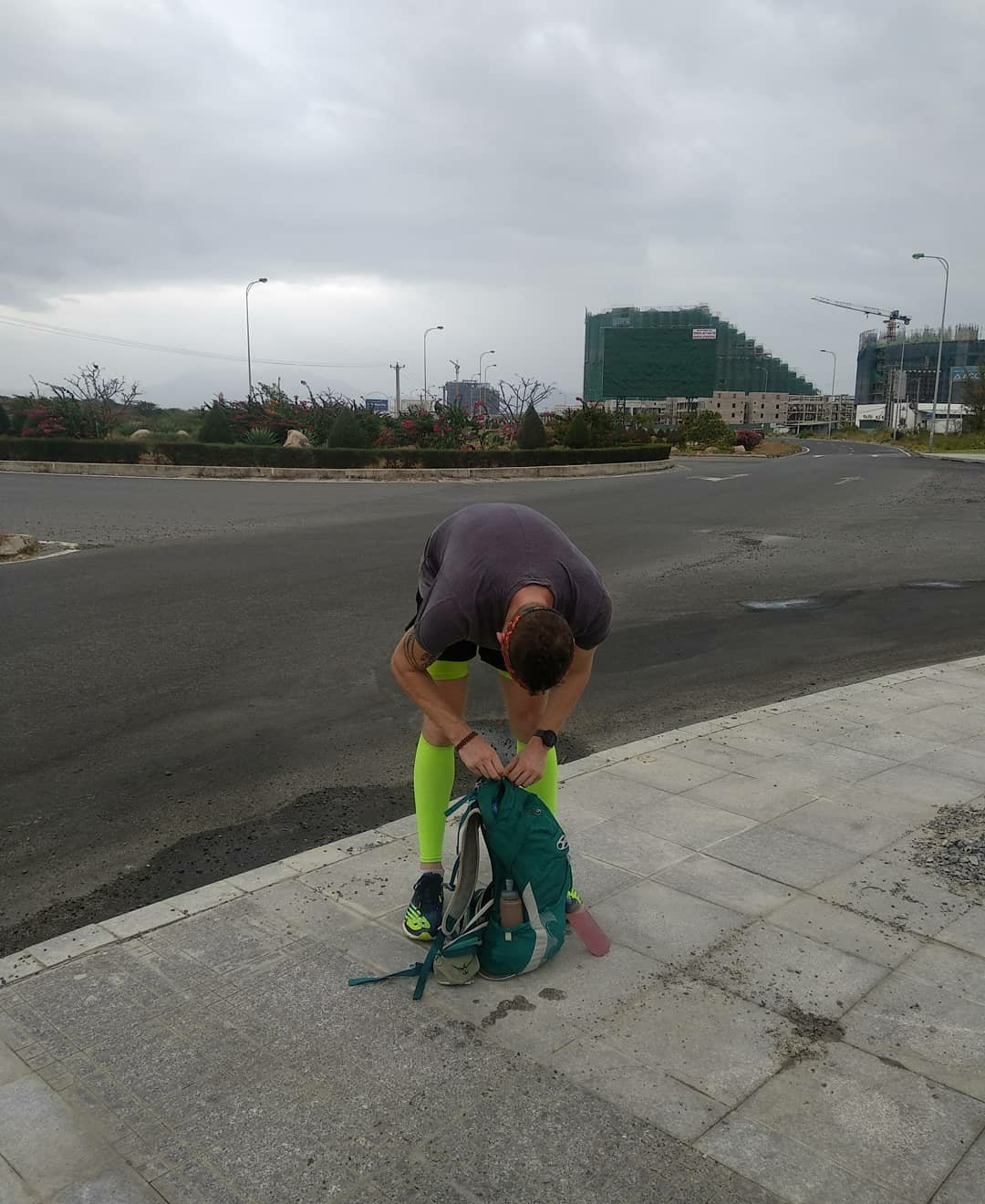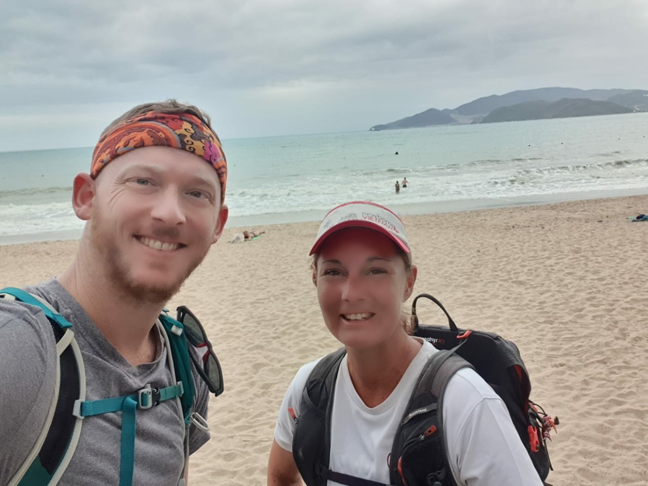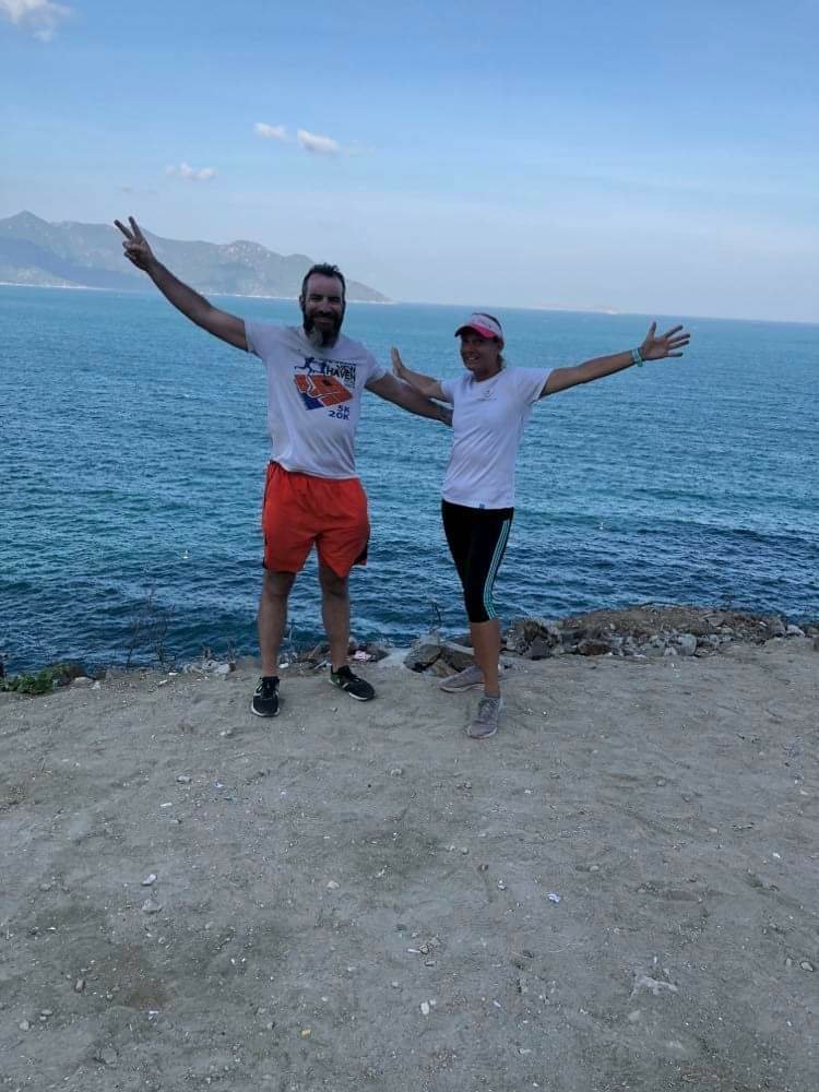 After a sugar hit of soft drinks, we hit the road again and ran comfortably down the other side of the winding mountain pass towards Cam Ranh Airport. We had soon reached the 30km mark and I was feeling strong, as though I could keep running (slowly) forever. This was Nick’s furthest run to date and he was beginning to feel the distance. However, he assured me that he wanted to push onwards to reach our marathon goal. At 33km, we heard the shout of a loud, American accent and a flash of stars and stripes sunglasses… it was Mikey! He was on his way to the airport and had been looking out for us. He handed over ice cold bottles of fizzy drinks and water and jumped back into his air-conditioned taxi. What a lovely, thoughtful surprise! Nick who was attempting to stick plasters on his chaffing nipples was delighted!